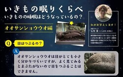 いきものの眠りについて飼育スタッフが解説するパネル「いきもの眠りくらべ」を館内10エリアに設置します。「オオサンショウウオはまぶたがなく、眠るときは目をつぶらない」「チンアナゴは全身を巣穴に隠して眠る」など、いきものの眠りや生態について学ぶことができる豆知識を紹介します。解説パネルを見ながら、実際に夜のいきものの観察を楽しむことができます。