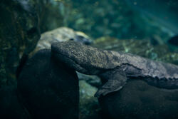 日中は水中にいることが多いですが、夜は岩場に上がって眠ります。前あし、後ろあしから熱を放出して体温を調節しているため、暑い夏の時期は大の字で寝ているかわいらしい姿を観察することができます。