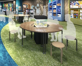 レイアウト変更が自由自在なテーブルとイスを採用し、お子さま向けのワークショップだけでなく、特別講義や大人向けのワークショップなど、イベントにあわせた空間づくりが可能で、これまで以上に幅広い多種多様な体験をご提供していきます。
