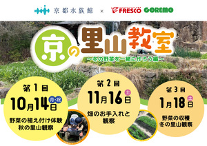 京都水族館(所在地:京都市下京区、館長:坂野 一義)は、このたび、総合食品スーパーマーケット「FRESCO」を展開する株式会社ハートフレンド(所在地:京都市下京区、社長:井上 壮一)と協業し、京都水族館内の「京の里山」エリアで野菜作りを体験する「京の里山教室2024~冬の野菜を一緒に作ろう編~」を2024年10月14日(月・祝)、11月16日(土)、2025年1月18日(土)の3日間で開催しますのでお知らせします。