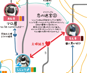 「しじょう」と「あね」の幼なじみ夫婦がまさかの破局。「あね」との争いに勝利し、「しじょう」と新たに夫婦になったのは、ぽっちゃり美女の「ちえ」でした。2羽の間には息子「うしわか」も誕生し、「しじょう」のイクメンぶりが注目を集めました。他のカップルや夫婦も含めた、四つの三角関係「恋の迷宮(トライアングル)」にご注目ください。