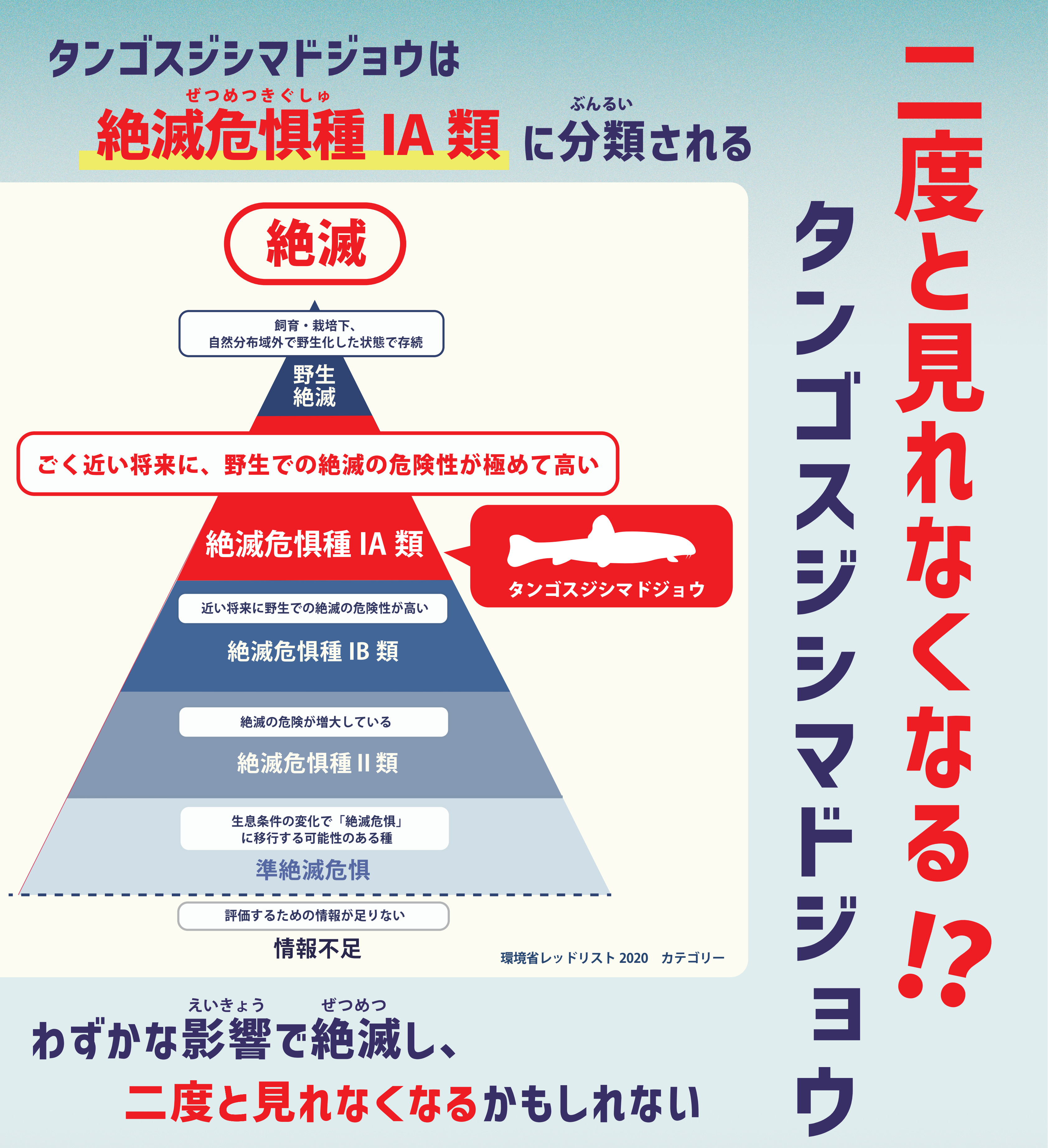 ※1 日本に生息または生育する野生生物について、専門家で構成される検討会が、生物学的観点から個々の種の絶滅の危険度を科学的・客観的に評価し、その結果をリストにまとめたもの。タンゴスジシマドジョウは「環境省レッドリスト2020」において、ごく近い将来における野生での絶滅の危険性が極めて高いもの(絶滅危惧IA類)に指定。