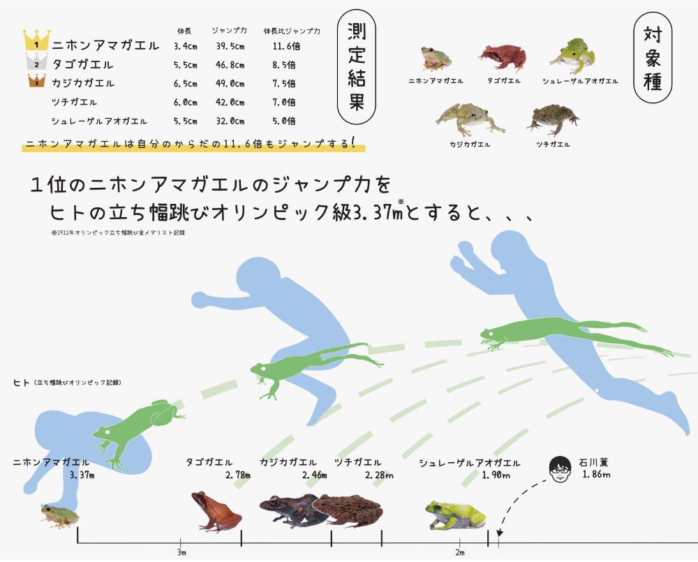今回は、展示する5種類のカエルのジャンプ力を飼育スタッフの石川が検証した測定記録を壁面に展示します。カエルの種類によって異なるジャンプ記録をぜひご覧ください。