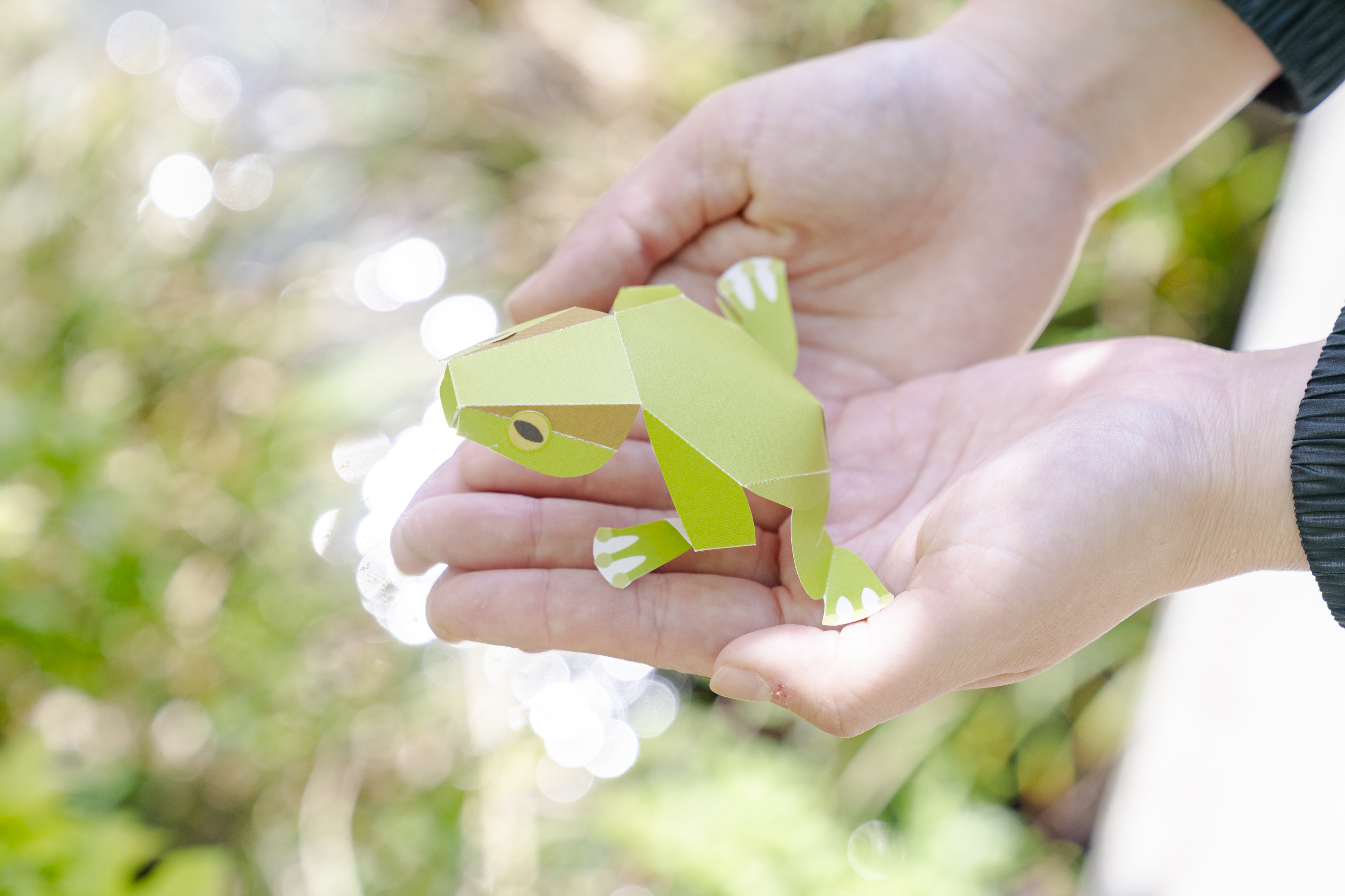 さらに、MAPの裏面には、工作が楽しめるアマガエルのクラフトが付いています。MAPをお持ち帰りいただき、ご自宅ではさみとのりを使って組み立てることで、アマガエルが完成します。