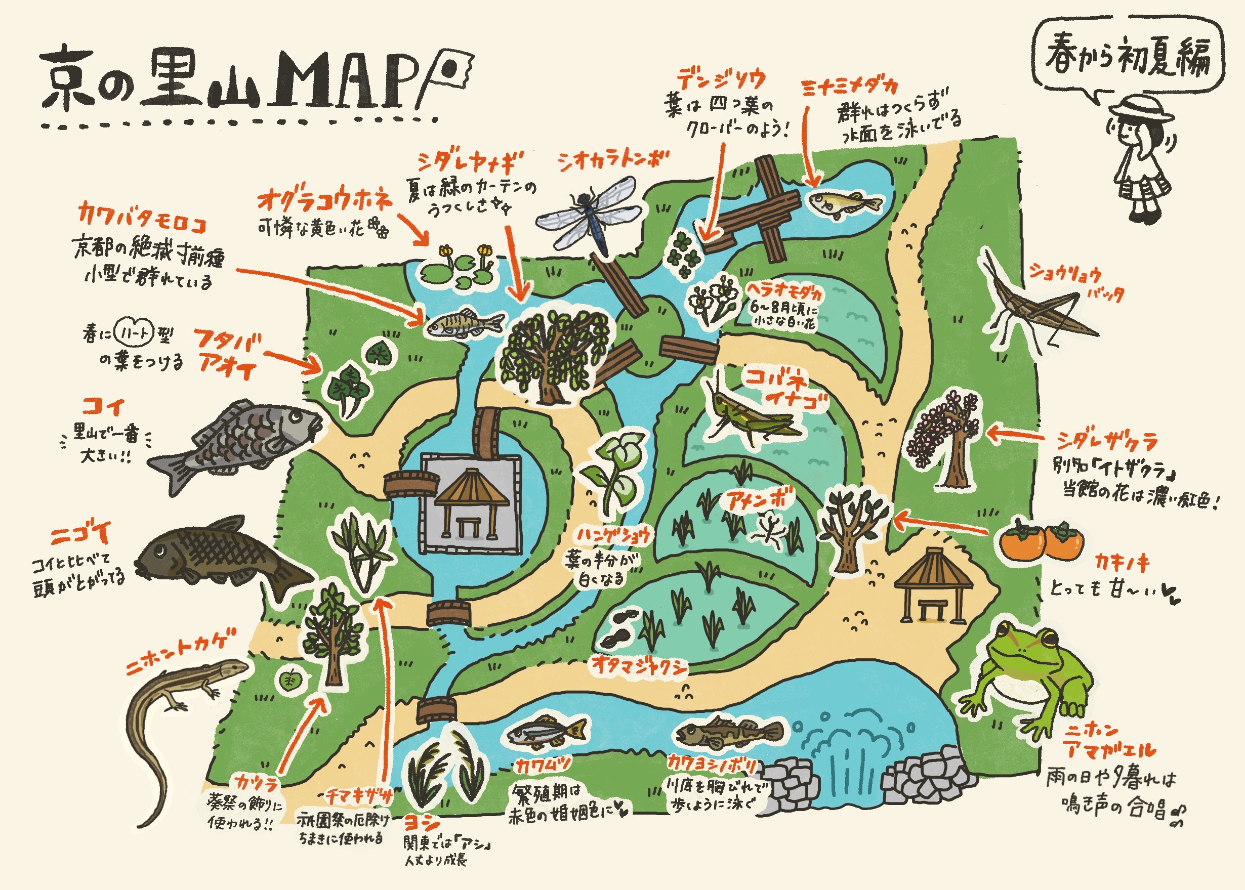春から初夏にかけて「京の里山」エリアで観察することができる魚や昆虫、植物などのさまざまないきものをまとめた「里山MAP」を配布します。5月に田植えを行った棚田にはアメンボやオタマジャクシがおり、下段のため池には京都府改訂版レッドリスト※に掲載されているカワバタモロコが泳いでいます。