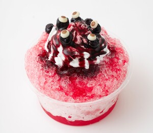 「水族妖怪通り」の展示を記念した妖怪モチーフのスイーツが登場。いちご味のかき氷にホイップクリームとブルーベリーソースをかけ、その上には目玉チョコをトッピングしました。暑い夏はひんやりかき氷をお楽しみください。