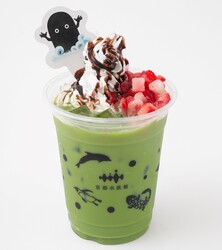 京都らしい抹茶ラテにフローズンストロベリーをのせたドリンクです。程よい甘みで暑い季節にピッタリです。「水族妖怪通り」でも紹介する海坊主のイラストを描いた特製ピックで飾りました。
