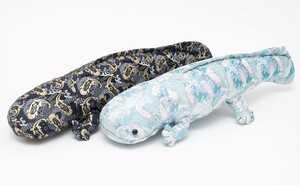 9月9日のオオサンショウウオの日を記念し、西陣織とコラボレーションしたオオサンショウウオぬいぐるみが新登場します。ひな人形の着物生地として織られる「西陣織金襴(きんらん)」を用いたぬいぐるみで、オオサンショウウオと和柄を組み合わせたデザインで、「黒×金」と「水色×銀」の2色をご用意。和テイストの一品なので京都観光のおみやげにもピッタリです。