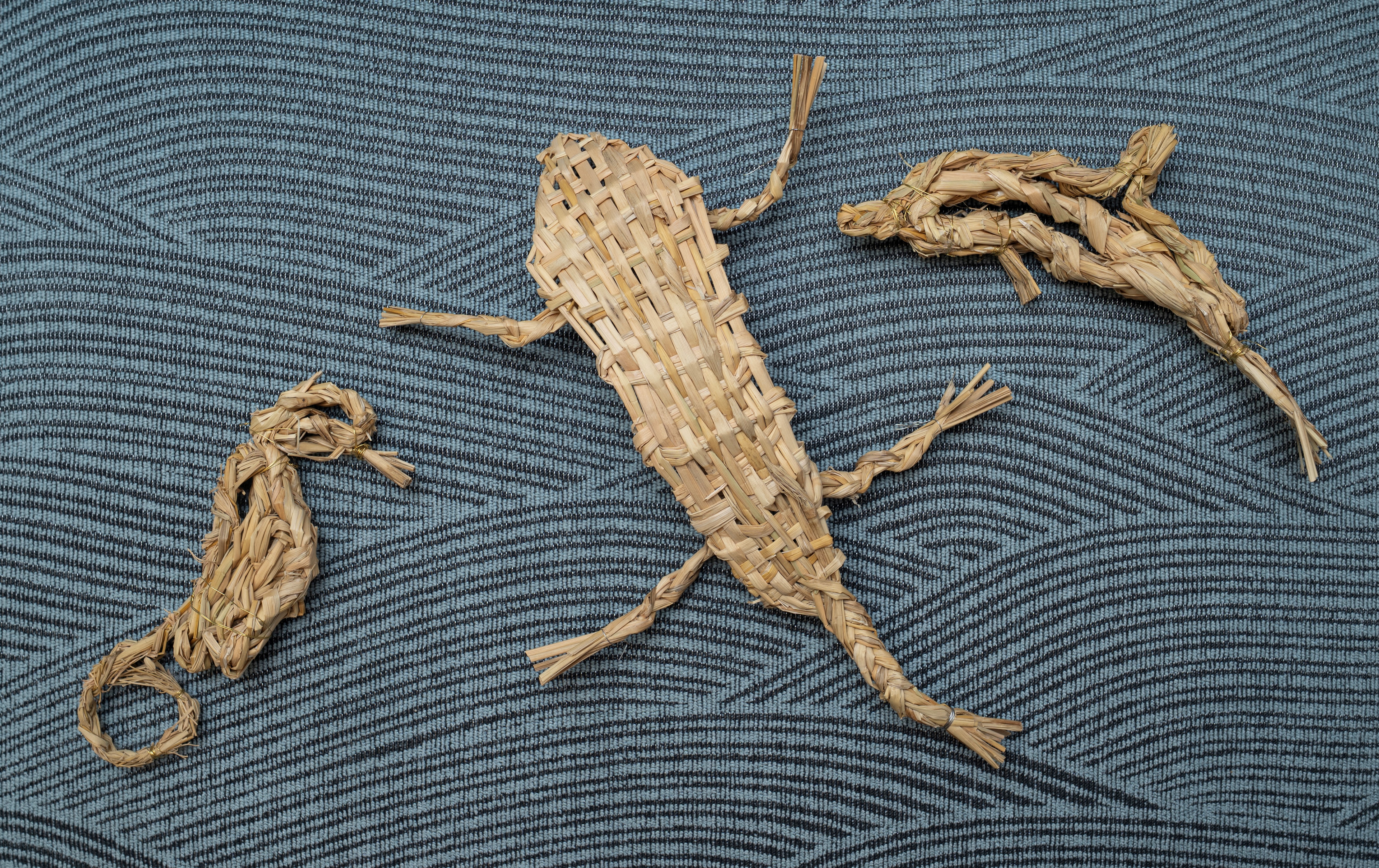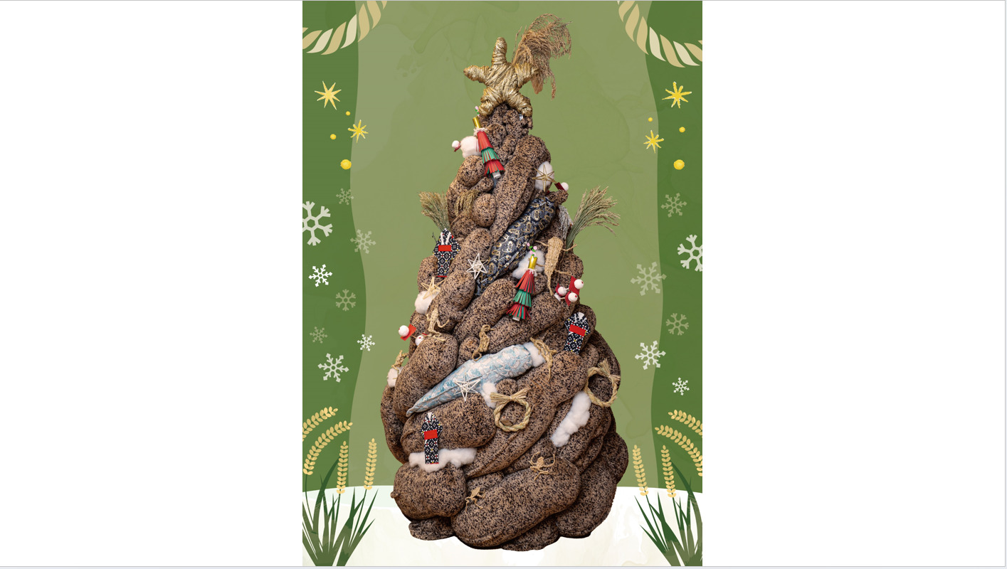 ツリーは、稲藁で制作したオオサンショウウオやカエルなどのオーナメントで装飾しました。さらに、木津川市・相楽神社の「餅花祭」の装飾「餅花」や、南山城村・田山花踊りの伝統的な装飾、南丹市・多治神社の「田原の御田」の衣装など、京都府内で豊作を願う祭事をモチーフにした装飾で彩りました。