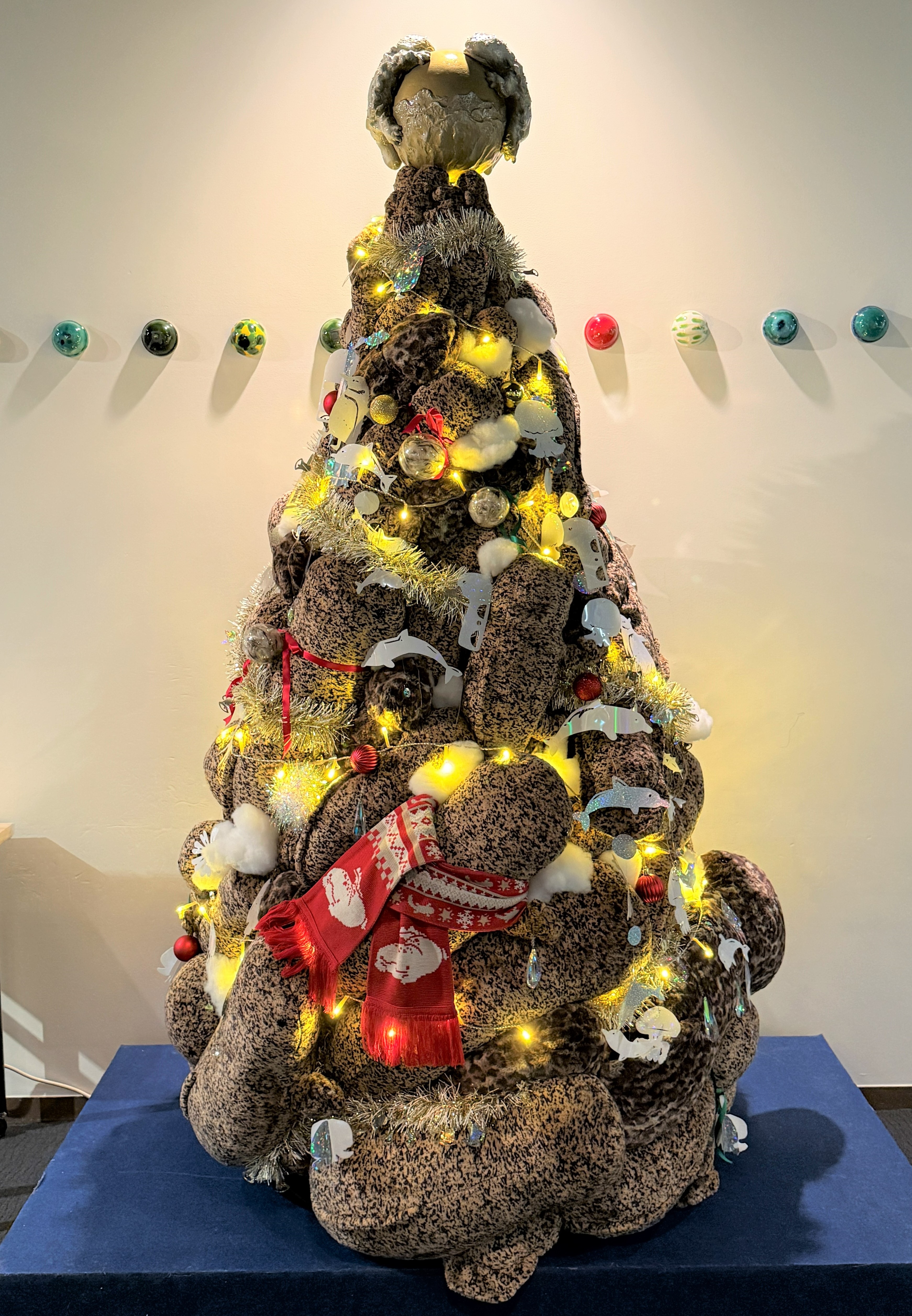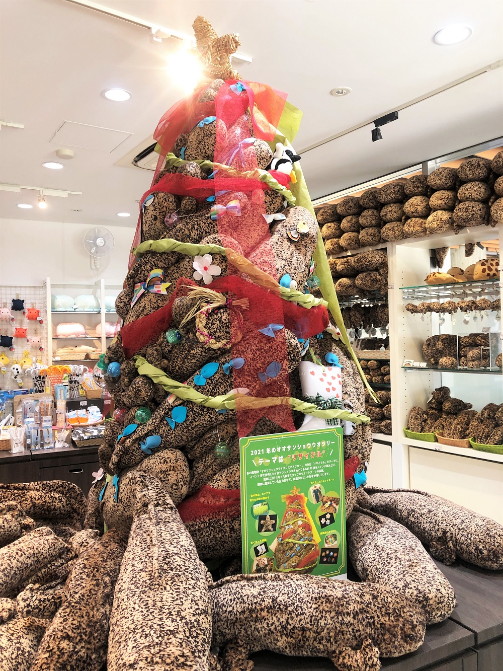 当館では、2013年より毎年、人気のオリジナルグッズ「オオサンショウウオぬいぐるみ」を積み上げてクリスマスツリーに見立てた「オオサンショウウオツリー」を展示しています。毎年、異なるテーマで、アイデアから制作まで水族館スタッフがすべて担当しています。
