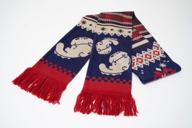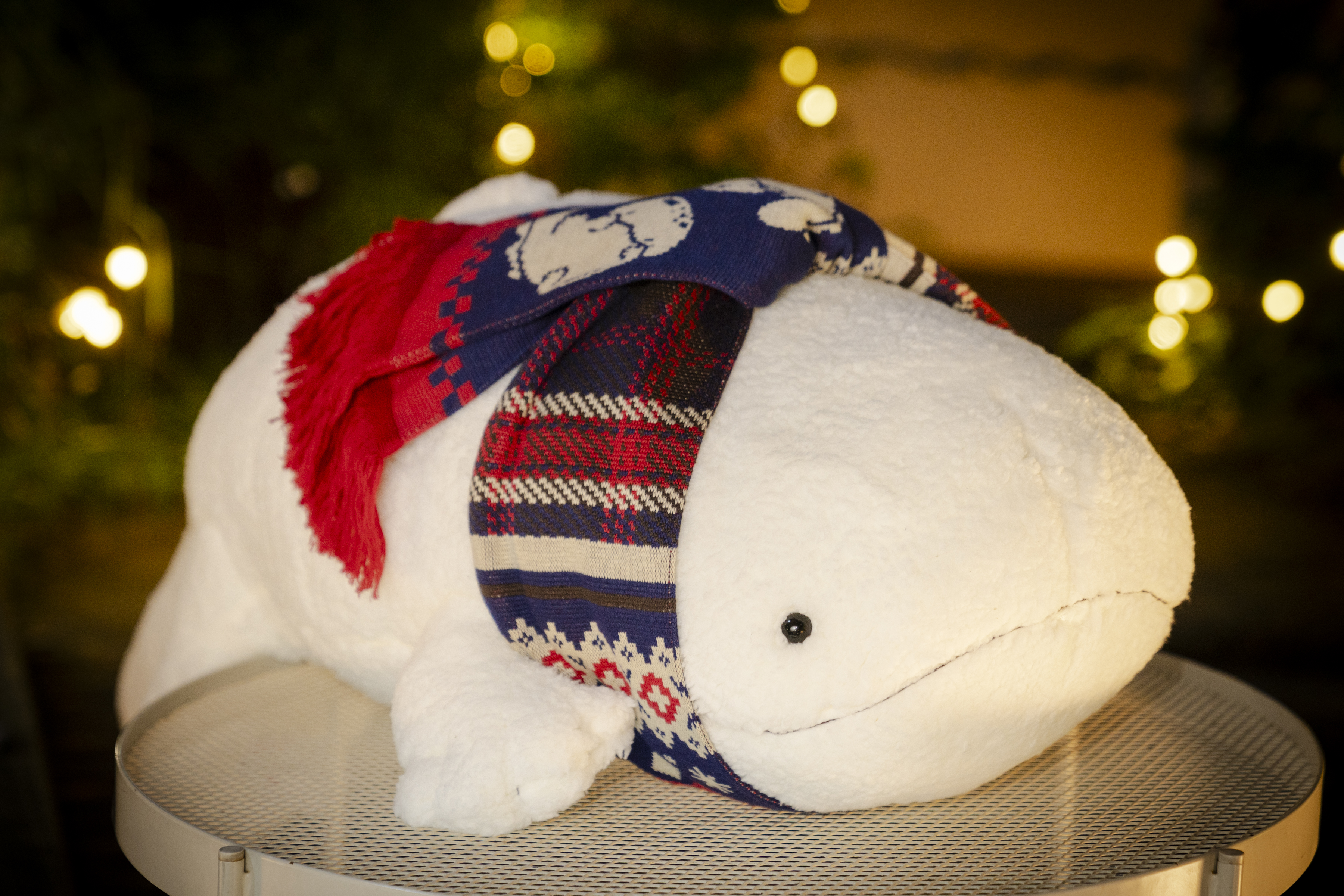 また、毎年デザインが変わる冬の人気グッズ「オオサンショウウオマフラー」も販売します。今年はネイビーを基調にしたチェック柄で、オオサンショウウオと目が合うデザインに仕上げました。さらに、昨年販売し、オンラインショップで150個が即日完売した「白色オオサンショウウオぬいぐるみ」を数量限定で再販します。今年限定のマフラーを巻いた特別仕様のぬいぐるみをこの機会にぜひお買い求めください。