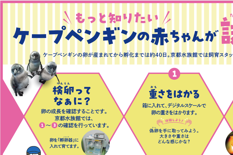 京都水族館では、ペンギンの卵が産まれると、ふ化の直前まで親鳥に代わり飼育スタッフが育てます。ふ化までの約40日間、毎日卵の成長を確認し、その記録を付けています。日々の成長確認では飼育スタッフがどのように工夫をしながら、どのような作業を行っているのかをまとめたパネル展示を行います。