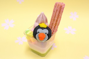 ミュージアムショップで販売しているペンギンのかたちをしたクリーム大福をそのまま1つのせた、見た目もかわいいオリジナルパフェです。パステルカラーで春らしさをイメージし、イチゴ味のソフトクリームとチュリトスをトッピング。和と洋のスイーツを一緒に楽しむことができます。