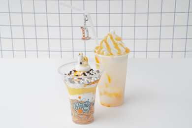 11月11日が記念日のチンアナゴとニシキアナゴをイメージしたパフェが登場。マンゴープリンと生クリームでオレンジと白の体色が特徴的なニシキアナゴをイメージしました。その上には、白い体に黒の斑点模様が特徴的なチンアナゴをイメージし、白黒のディッピンドッツをトッピング。かわいいマシュマロと一緒にお楽しみください。